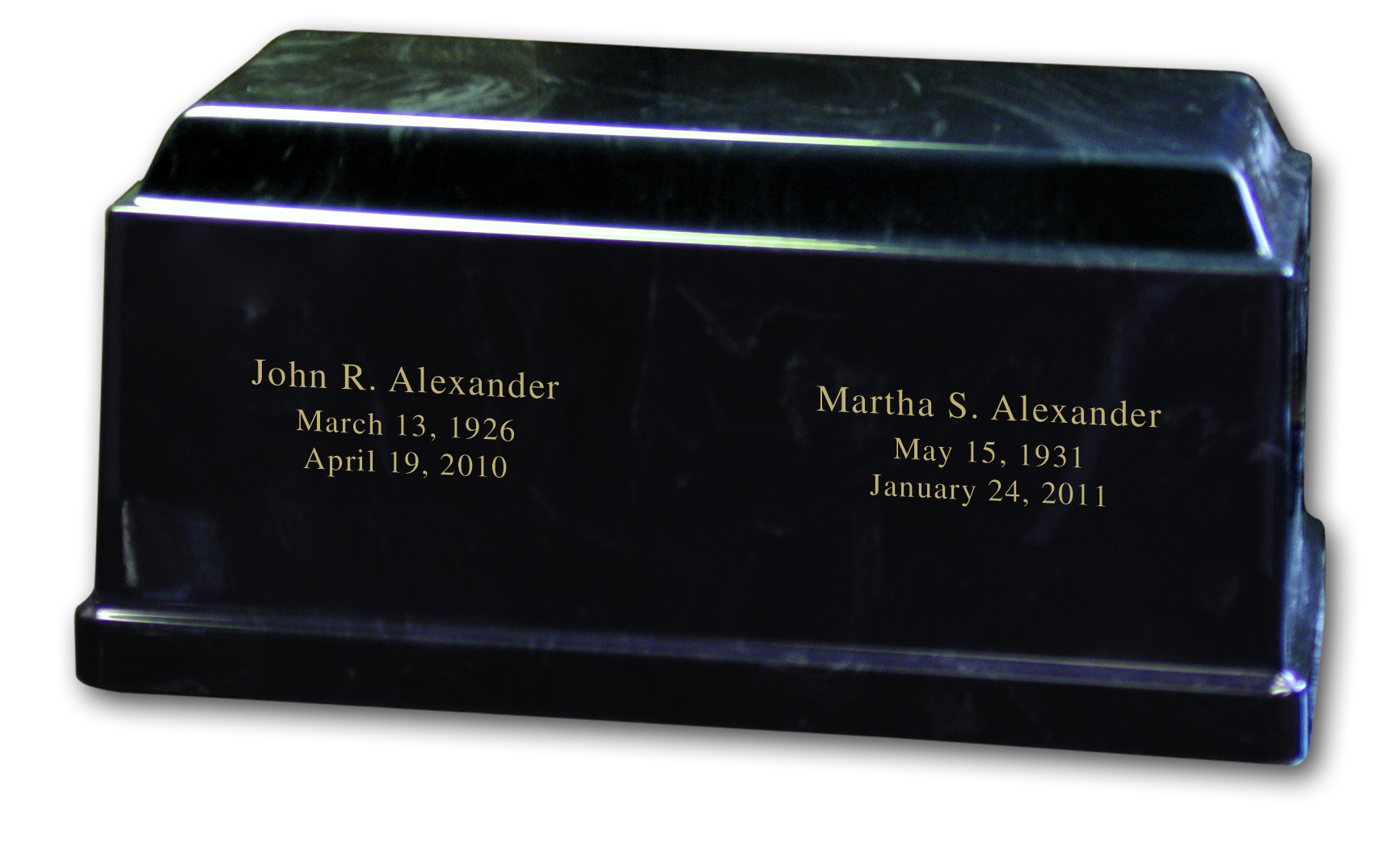 A hand-crafted cultured marble urn with 2 compartments, matching keepsake available.